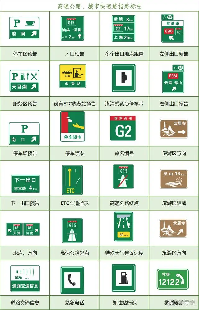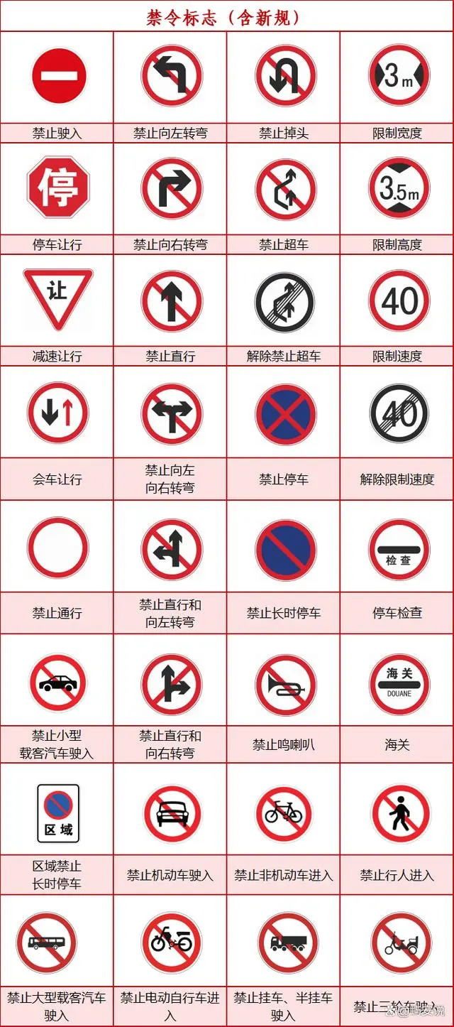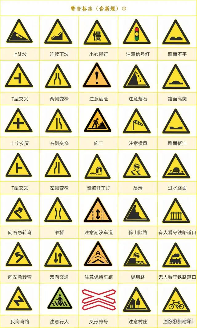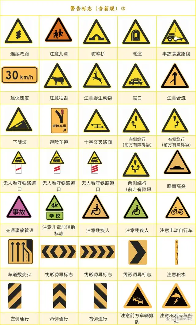 ## 一、判断题 * 含下列情况都判断为对的(√): √基本上不准驾驶员做的都是对的(不应、不能、不准、不得、禁止、严禁) √主动让行的都是对的(停车让行、减速让行、礼让、靠边减速避让) √缓慢通过的都是对的(慢速通过、减速、慢行通过、平稳、将速度降低) √注意观察的都是对的(减速观察、左右观察、停车观察、瞭望后通过) √确认安全的都是对的(保证安全、安全通过、确认安全、轻踏制动踏板) * 含以下情况判断为错的(×): ×决策武断的都是错的(只要、只用、只需、就可以了) ×快速通过的都是错的(加速通过、急打方向、猛打方向、紧急制动、不减速) ## 二、停车距离题 口五站三 * “口五”是指机动车在距离交叉路口、弯路、陡坡、隧道50米以内不准停车; * “站三”是指机动车在距离急救站、加油站、消防站30米以内的路段,不准停车; 题目里有“口”的选50米,有“站”的选30米,叫“口五站三"。 剩下的全选150米,没有150的选最大。 ## 三、行车速度题 * 特殊路段限速 机动车驶入驶出<非机动车道/通过铁路道口、急转弯、转弯、窄路、窄桥、掉头、下陡坡、牵引故障机动车>最高时速不准超过30公里 * 有无中心线 1. 没有道路中心线的:城市30;公路40 (城3公4) 2. 有中心线双向单车道:城市50;公路70 (城5公7) 3. 有中心线双向二车道及以上:城市60;公路80 (城6公8) * 高速同方向车道最低限速: 1. 二条车道(左百右6) 左:100 ;右:60 2. 三条车道 (左百1右6中9)左:110 ;中:90 ;右:60 3. 三条以上/四车道 最左:110 ;中间二条:90 ;最右:60 4. 进入高速加速车道,尽快提到(60公里)以上 * 特殊天气限速(口诀:261,145,520)分别表示能见度、车速、车距 * 高速公路遇到雨、雾、沙尘、冰雹等能见度低的特殊天气时,高速公路行车限速 1. 能见度小于200米时,开启雾灯、近光灯、示廓灯、前后位灯,车速不得超过每小时60公里,与同车道前车保持100米以上的距离; > 261:“2”是能见度<200米;“6”是车速不能超多60km/h;“1”是安全距离100米 2. 能见度小于100米时,开启雾灯、近光灯、示廓灯、前后位灯、危险报警闪光灯,车速不得超过每小时40公里,与同车道前车保持50米以上的距离(145) 3. 能见度小于50米时,开启雾灯、近光灯、示廓灯、前后位灯和危险报警闪光灯,车速不得超过每小时20公里,并从最近的出口尽快驶离高速公路(520) * 高速不同车辆最高限速: * 小型载客汽车:120公里 * 摩托车:80公里 * 其他机动车:100公里 ## 四、标志题 警告标志距离: 放警告标志,只有两种距离: * 普通路50-100米 * 高速公路150米 交通标志类型: * 警告标志:注意危险或减速慢行. * 禁令标志:禁止或限制. * 指示标志:指示车辆、行人行进的标志. 颜色区别:警告黄色、禁令红色、指示蓝色。 标志完整版如下图:        ## 五、灯光题 转向灯: 车辆变换位置都要开转向灯,唯一一个不开灯的就是进环岛。 灯光使用: 1. 雨天、雪天、夜间起步、跟车、会车或照明良好的路段要用近光灯  2. 照明不良好的路段使用远光灯  3. 通过急弯、坡路、拱桥、人行横道、没有信号灯控制的交叉路口以及超车的时候应交替使用远近光灯 4. 转向灯都要提前开,不开灯的不对 5. 危险报警闪光灯在大雾天气、高速跟车排队、发生故障难以移动、临时停车的时候用 6. 雾天要开雾灯,雪天不用开雾灯 后雾灯:  前雾灯:  ## 六、时间类题型 1. 假1 吊2 骗/撤/毒3;醉5 无/罪10 逃终生。 * 假1现在是指考试舞弊,1年内不能获取驾照; * 吊销2年内不可获取; * 撤销或者欺骗贿赂取得驾照3年不得获取驾照; * 醉酒5年内不可以获取; * 无证驾驶致人重伤或死亡的,10年内不得获取驾照; * 逃逸终生不可获取。(醉驾犯罪的也是) 2. 因出国、服兵役无法审验最多延期3年,且3年中不可以驾车。 3. 学习驾驶证明有效期3年。 4. 科目二科目三预约不能超过5次。 5. 身体证明在六个月内有效。 6. 驾驶证补发15日,转移登记30日。 7. 驾驶证有效期满提前90日,机动车报废提前两个月,更改信息30天。 8. 初次申领驾驶证实习期一年。 9. 累计记分周期是12月。 10. 小型汽车驾驶证年龄:18周岁以上 11. 牵引挂车年龄:20—60周岁 12. 看到科目一选1天,没有科目一选5天。 ## 七、吊销驾驶证(并处200~2000罚款): 1. 驾驶拼装\报废车 2. 违法逾期不接受处理 3. 超速50% 4. 把车交由未取得驾照(无照)/驾照暂扣期间/驾照被吊销期间的人驾驶(把车交给无证人员驾驶)你把车交给驾照被吊销的人开,你的证也会被吊销(相当于连坐) ## 八、扣留机动车(罚款200~2000): 1. 伪\变造或使用伪\变造机动车 (驾驶证\行驶证\登记证\保险标志\检验合格标志) 2. 使用其它车辆的(行驶证\登记证\保险标志\检验合格标志\号牌) 3. 车上道行驶(未放置保险标志\未放置检验合格标志\未悬挂车号牌\未随车带行驶证) ## 九、15日以下拘留: 1. 未取得驾照的人驾车 2. 驾照暂扣期间驾车 3. 被吊销期间驾车 4. 肇事逃逸,尚不构成犯罪 5. 醉酒后驾车 ## 十、酒后驾车: 1. 饮酒后驾车,处暂扣驾照(6个月),罚款1000~2000 2. 再次饮酒后驾车,处10日以下拘留,罚款1000-2000元,吊销机动车驾驶证 3. 醉酒后驾车,约束至酒醒,吊销机动车驾驶证,5年内不得重新取得驾驶证 4. 饮酒后驾驶营运机动车,15日拘留,罚款5000元,吊销机动车驾驶证,5年内不得重新取得驾驶证 5. 醉酒后驾驶营运机动车,吊销机动车驾驶证,依法追究刑事责任;十年内不得重新取得机动车